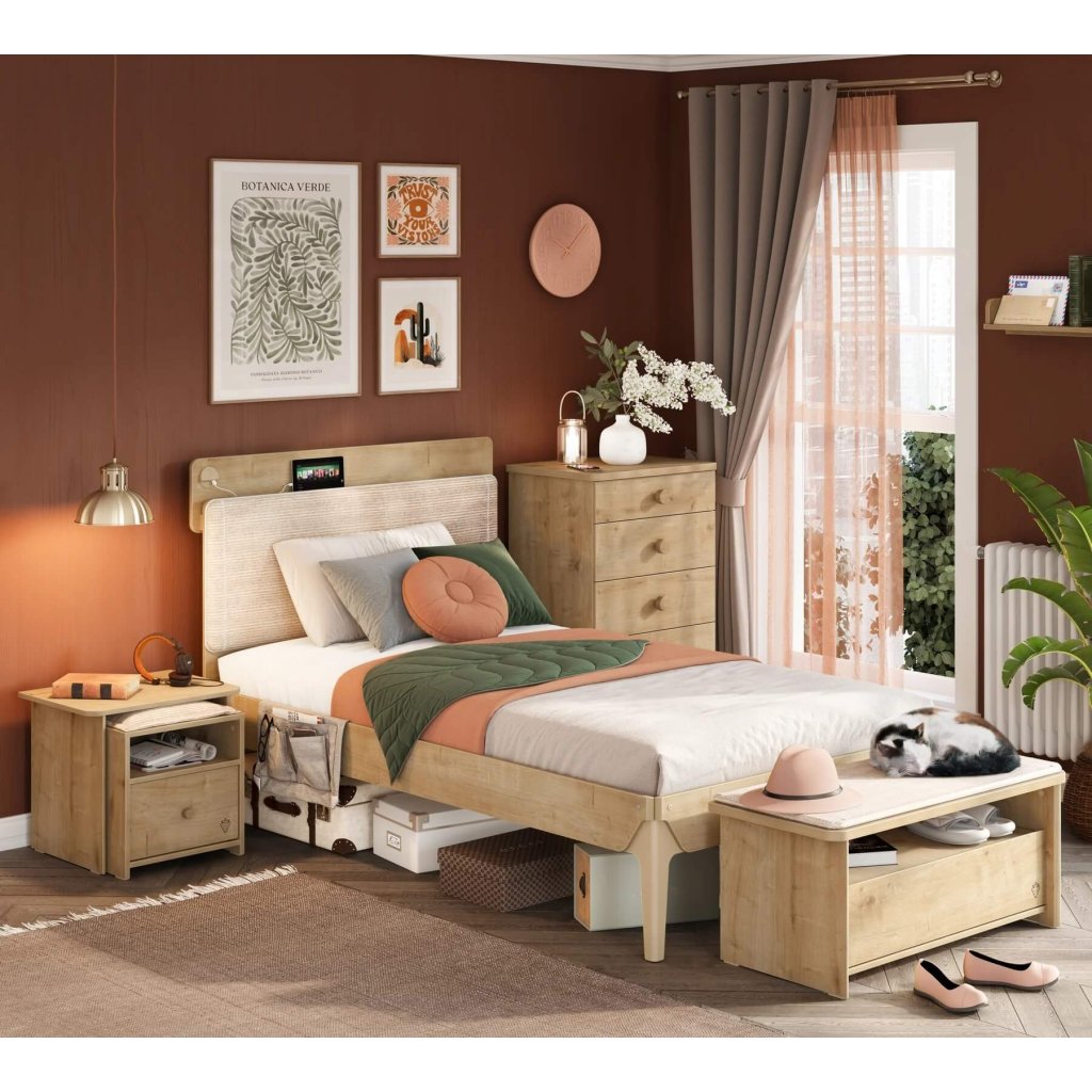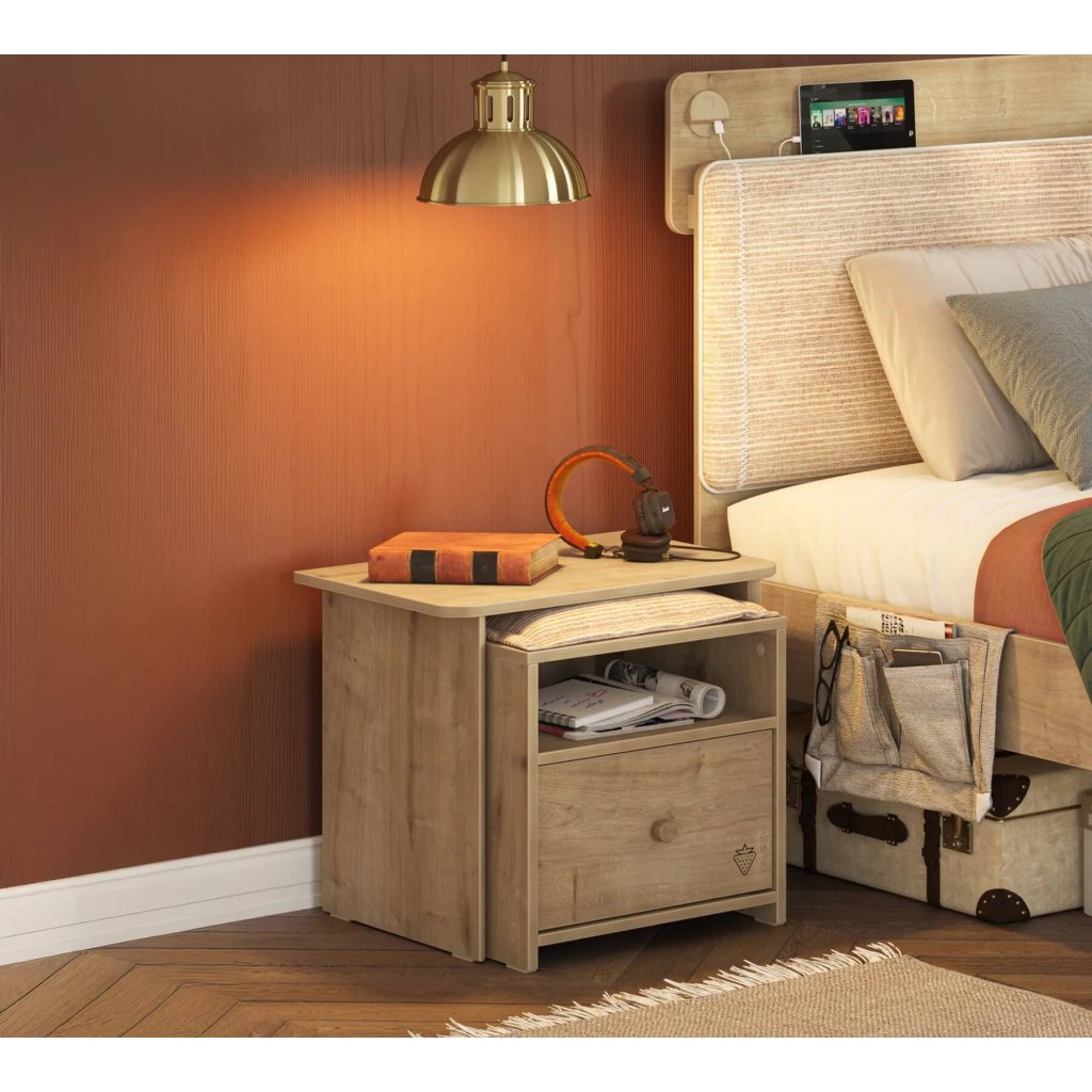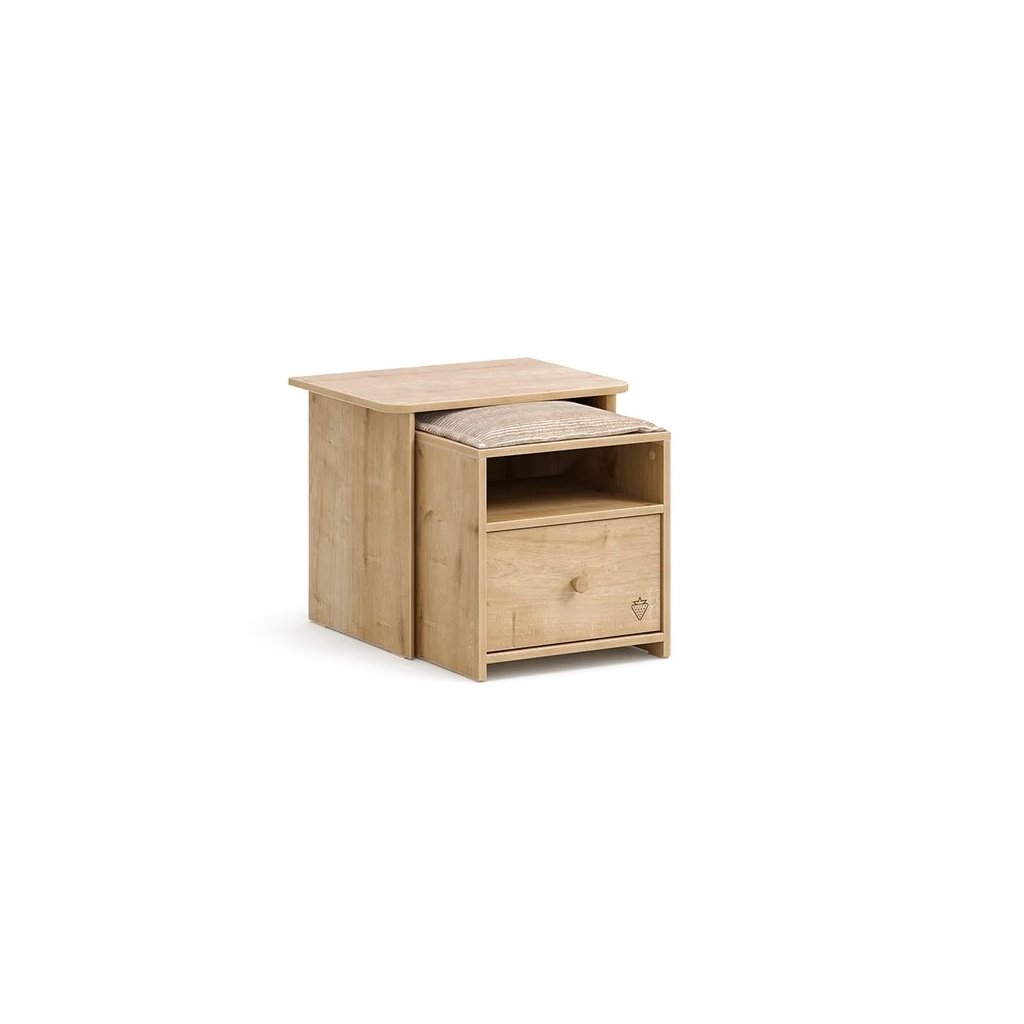 Tak malý prvek a tak praktický! Nový noční stolek z kolekce Mocha v sobě ukrývá odkládací plochu na vše potřebné k posteli (lampička, budík, telefon, brýle, atd.), úložný prostor v zásuvce a čalouněný taburet pro usazení návštěvy. Moderní nábytek do studentského pokoje patří a líbit se jistě bude chlapcům i děvčatům.