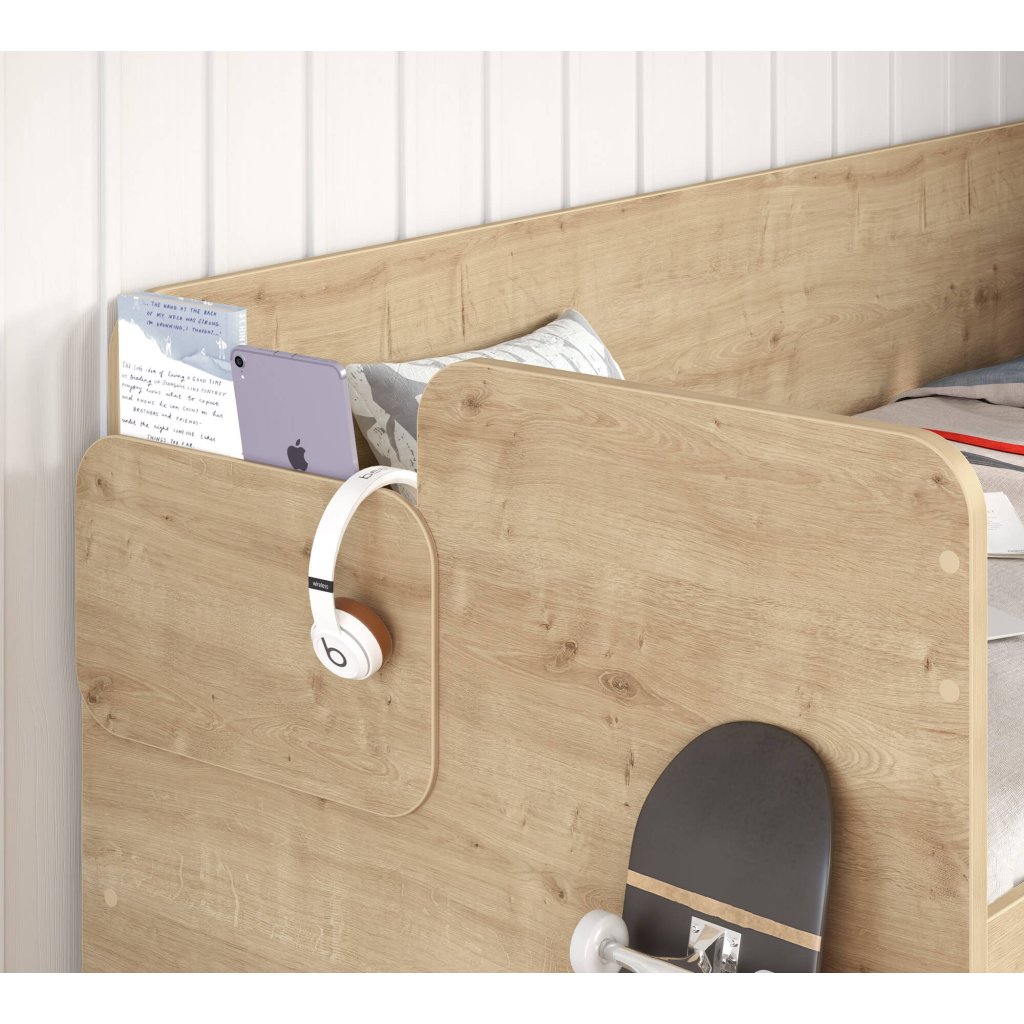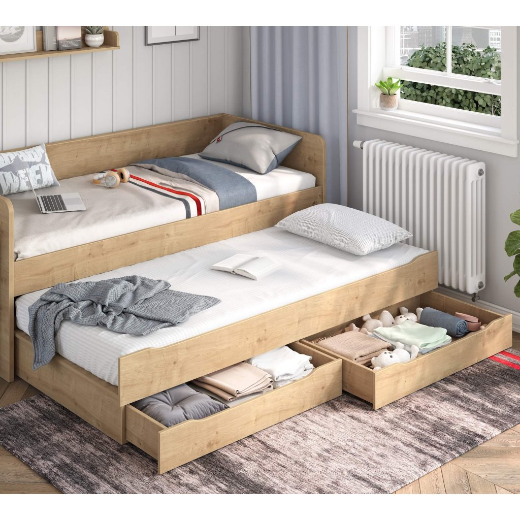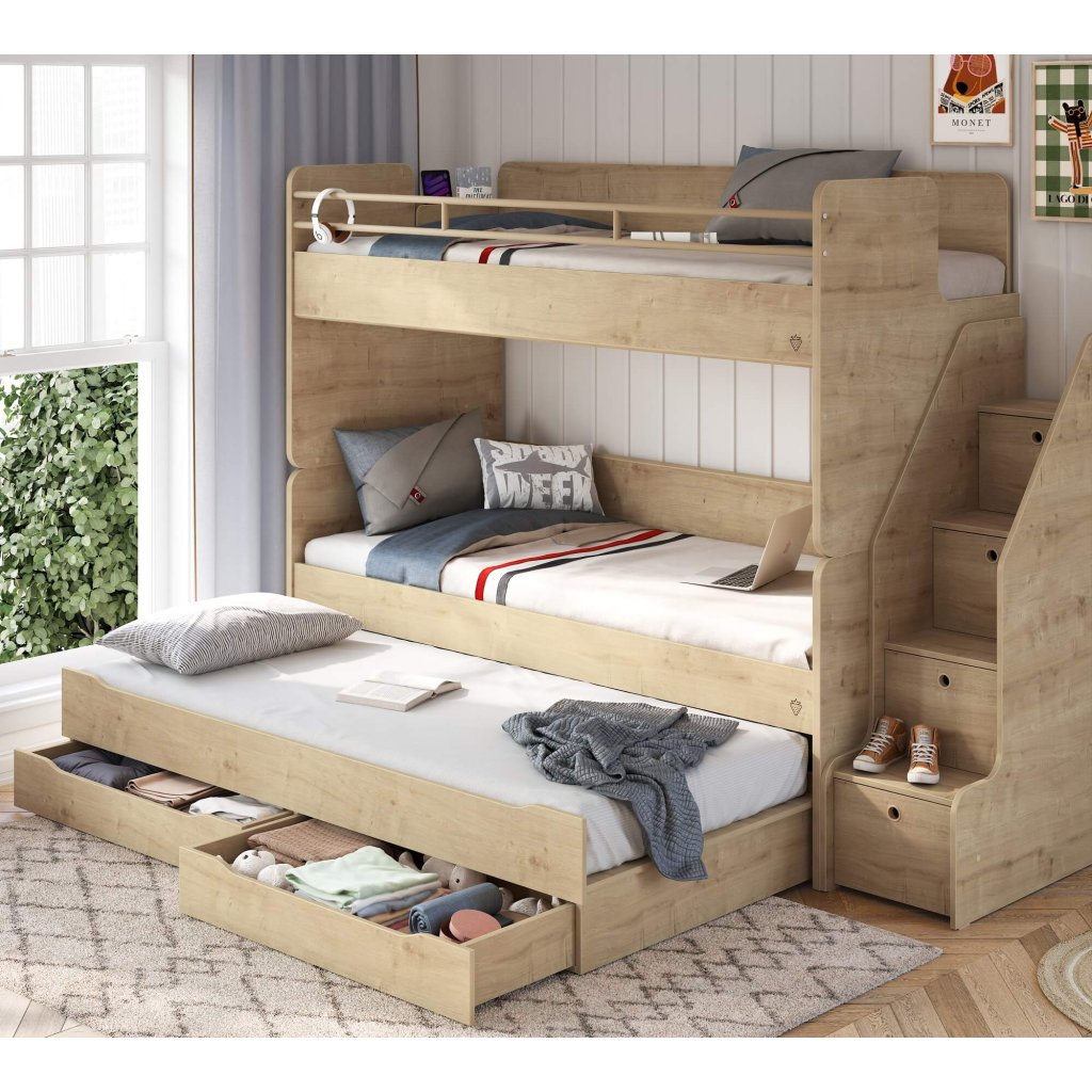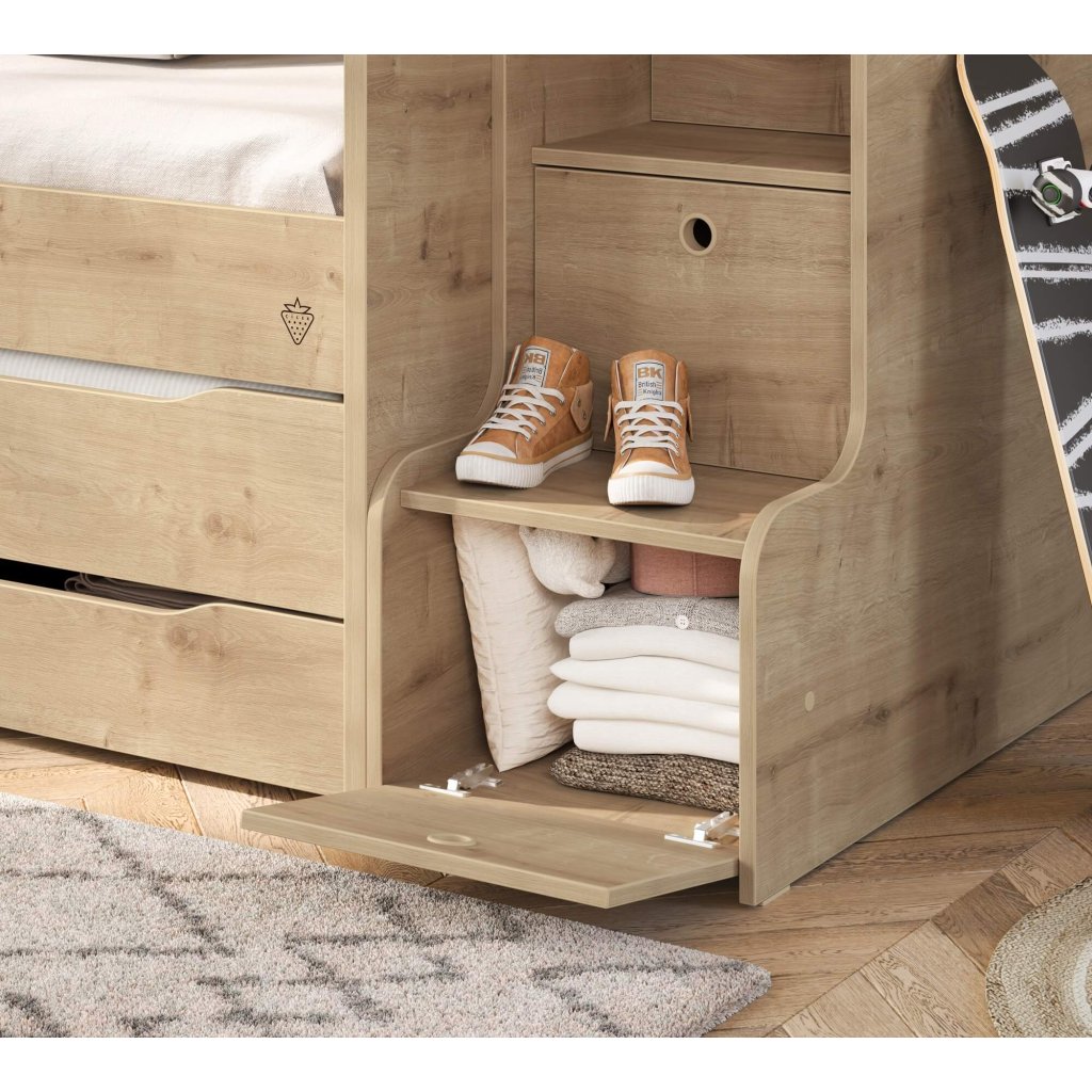 Pod spodním lůžkem najdete přistýlku spolu s dvěma zásuvkami, ideálními pro ukládání hraček, oblečení nebo dalších věcí. Úložné prostory se nachází také ve schůdcích s výklopnými dvířky. Pokud třetí lůžko nevyužijete, dá se použít také jako další úložný prostor, kterého v dětském pokoji není nikdy dost. Celý výsuv stojí na pogumovaných kolečkách, díky nimž lze celý modul vysunout bez poškození podlahy a umístit kdekoliv v pokoji.