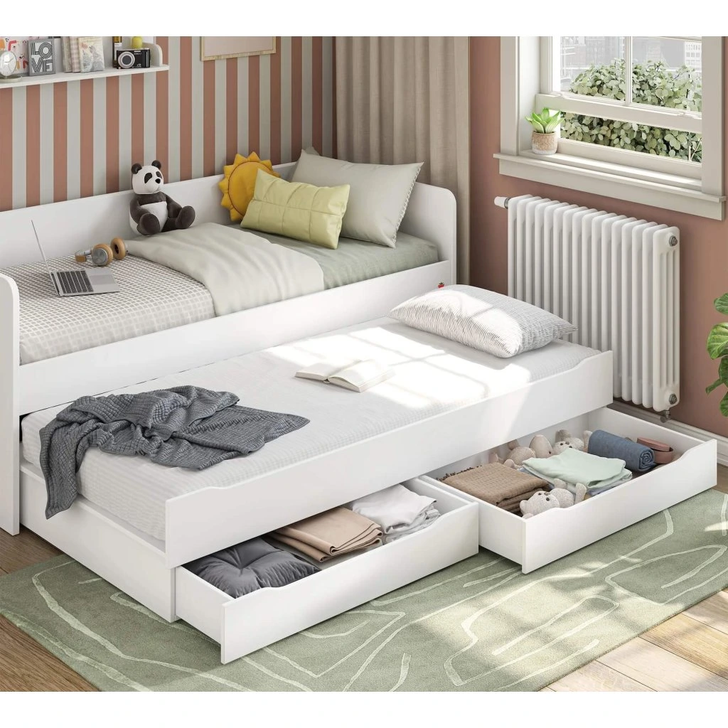Pod spodním lůžkem najdete přistýlku spolu s dvěma zásuvkami, ideálními pro ukládání hraček, oblečení nebo dalších věcí. Úložné prostory se nachází také ve schůdcích s výklopnými dvířky. Pokud třetí lůžko nevyužijete, dá se použít také jako další úložný prostor, kterého v dětském pokoji není nikdy dost. Celý výsuv stojí na pogumovaných kolečkách, díky nimž lze celý modul vysunout bez poškození podlahy a umístit kdekoliv v pokoji.