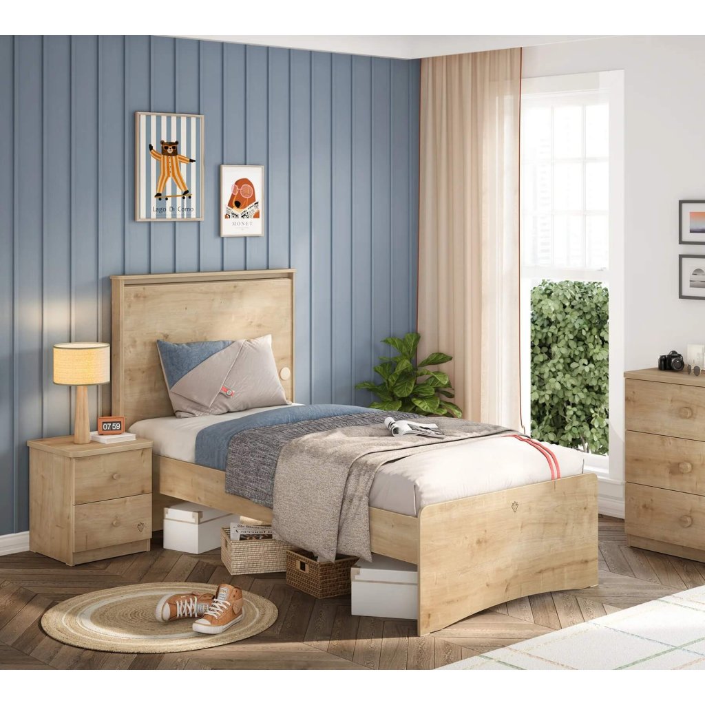 Studentská postel o rozměru 100x 200 cm v dekoru dubu se hodí jak do pokoje pro holku, tak i pro kluka. Čelo k posteli je vybaveno dvěma vstupy USB pro připojení chytrého telefonu, tabletu, lampičky či jiných dalších zařízení s možností propojení přes USB.