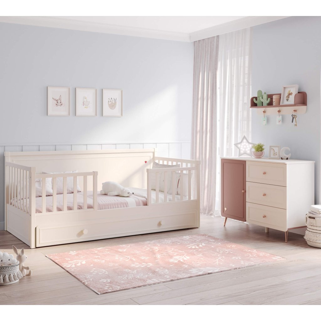 Postel s odnímatelnou bočnicí a pohovka 2v1 nabízí nadstandardní lůžko o rozměru 100x200 cm a to i pro ty nejmenší děti. Součástí postele jsou přední zábrany proti pádu. Až vám ratolest povyroste a nebude již bočnice potřebovat , tak je jednoduše z přední strany demontujete. Po demontování máte pohovku, kterou lze využít až do dospělosti. Nosnost postele je totiž 130 kg.