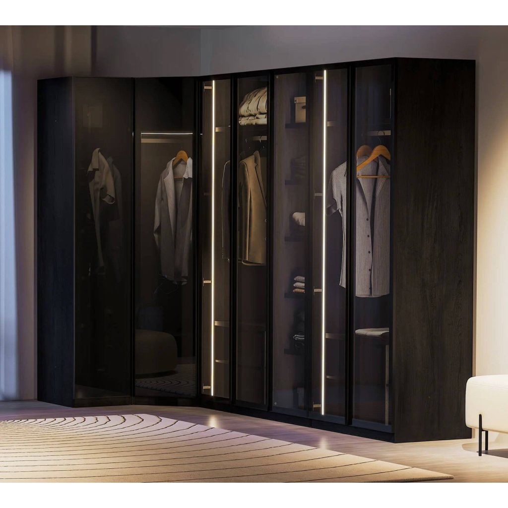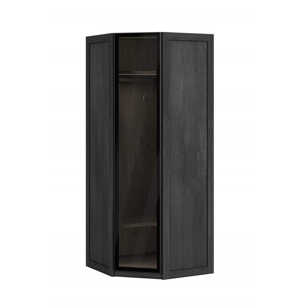 Rohová šatní skříň se skleněnými dveřmi nabízí dostatek úložného prostoru v každém studentském pokoji . Elegantní kombinace černé barvy a tvrzeného skla zajisté nadchne každého teenagera.