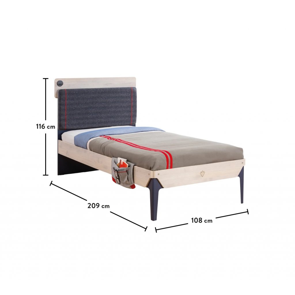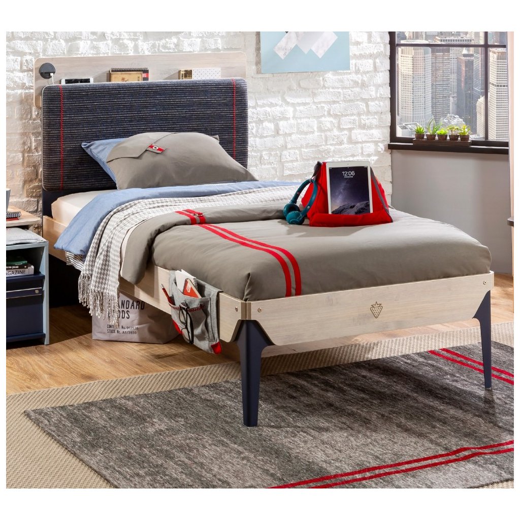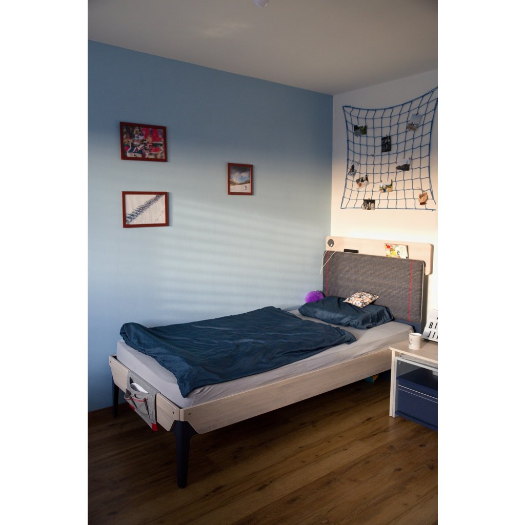 Kolekce Trio nabízí moderní nábytek do studentského pokoje dívek i chlapců. Studentská postel o rozměru lůžka 100 x 200 cm z kolekce Trio nabízí komfortní plochu pro spánek, odpočinek či relaxaci dospívajících i studentů. Postel je vybavena dvěma vstupy USB pro připojení chytrého telefonu, tabletu, lampičky či jiných dalších zařízení s možností propojení přes USB. Komfort lůžka zvyšuje i čalounění čela a polička vhodná k odkládání knih a dalších drobností. Vzdušnost posteli dodávají subtilní kovové nohy. Součástí je kvalitní deskový rošt uložený na kovovém rámu. Také tento typ postele disponuje látkovým kapsářem (na telefon, časopis či učebnici).