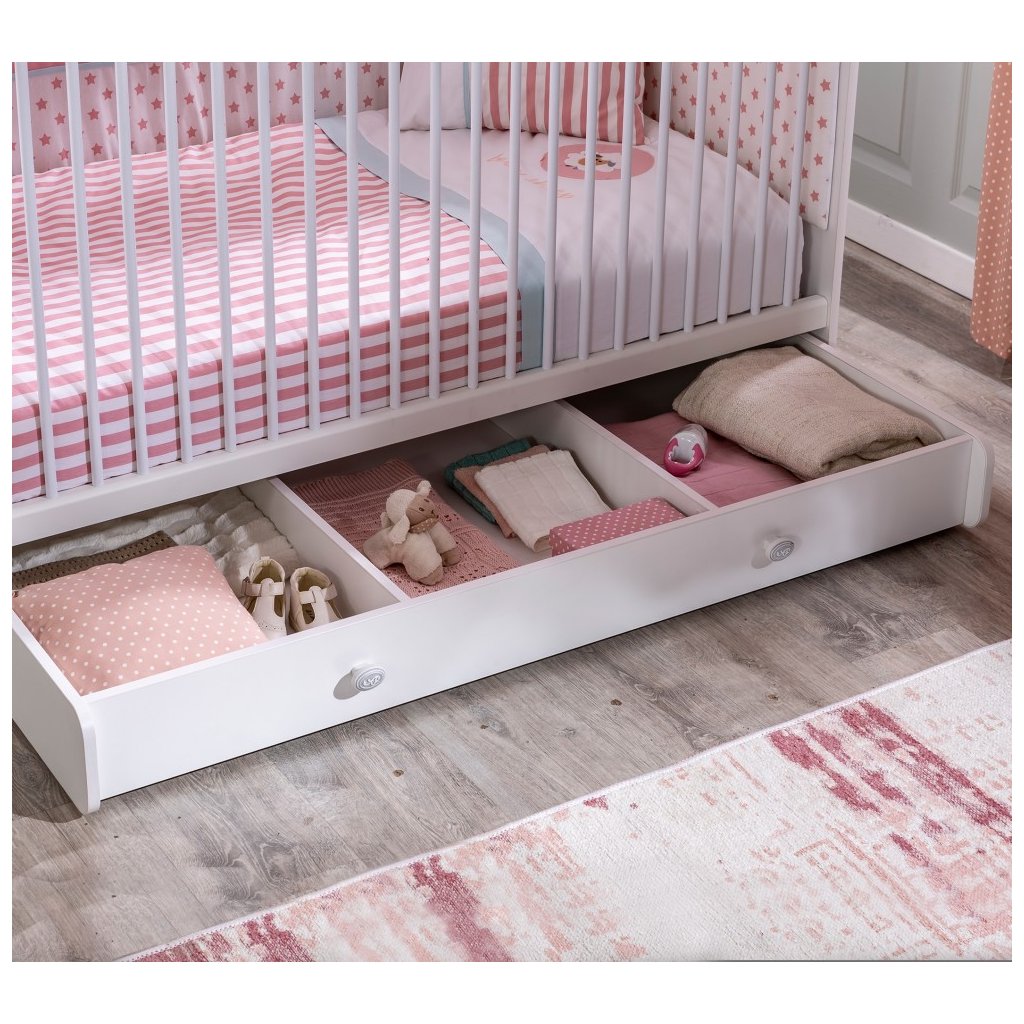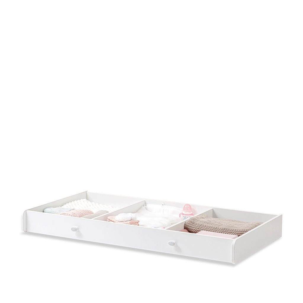 Tato zásuvka je určena pod dětskou postýlku Romantica Baby. Zásuvka pod postýlku je velice praktickým nábytkovým prvkem v dětském pokoji. Zásuvku využijete jako objemný úložný prostor. Zásuvka je rozdělena dvěma příčkami na tři části, což jistě oceníte při ukládání věcí. Díky příčkám je úložný prostor přehlednější. Zásuvkou lze snadno manipulovat díky pojízdným kolečkům.