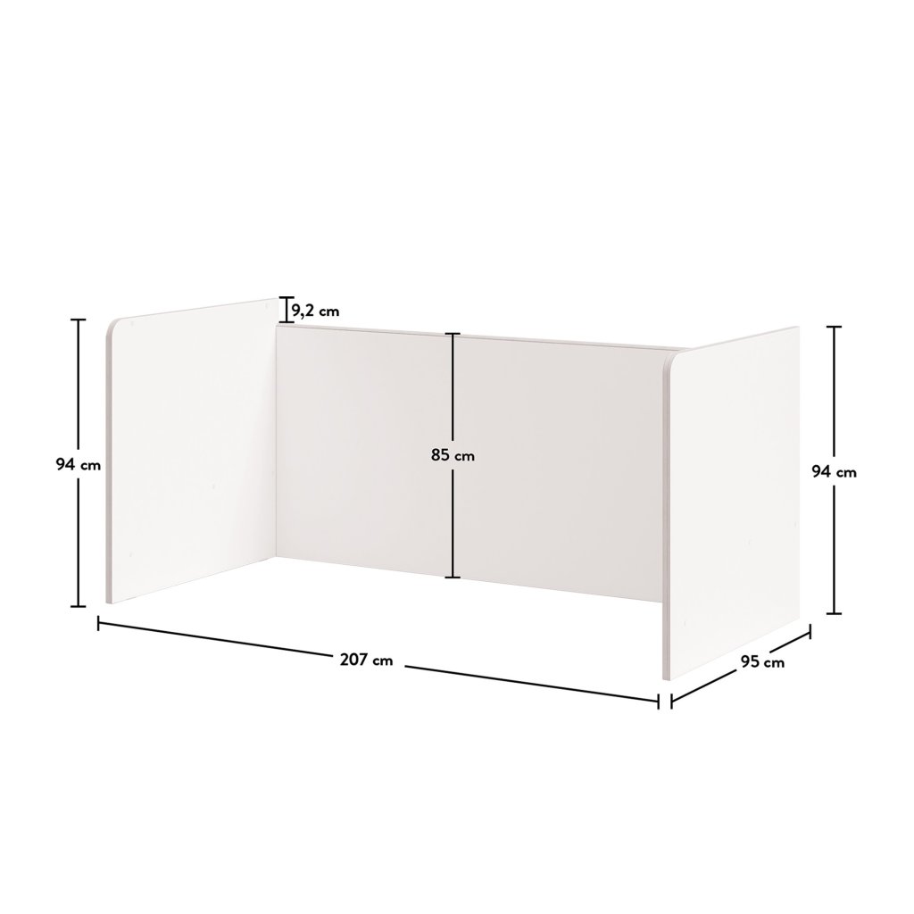 Horní postel má spací plochu o velikosti 90x200 cm a nosnost 130 kg. Součástí této zvýšené postele je na její přední straně kovová zábrana. Vzhledem k těmto parametrům je tak vhodná pro menší i větší děti, studenty i dospělé osoby. Horní postel je možné umístit na podlahu a tak ji využít např. jako samostatnou studentskou postel. Součástí zvýšené postele je také přenosná police na knihy nebo jiné předměty. Spojením horní postele a spodního rámu sestavíme vyvýšenou postel s úžasným volným místem pod postelí, který ocení hlavně menší děti při hrách a zábavě. V dalším období vývoje dětí lze tento prostor využít k umístění psacího stolu, skříně nebo třeba úložných boxů. K jednoduchému a bezpečnému přístupu k hornímu lůžku slouží schody s úložným prostorem uzavřeným dvířkami. Horní postel, spodní rám a schody jsou spolu pevně spojeny. Tímto je docíleno maximální pevnosti a stability celé sestavy.