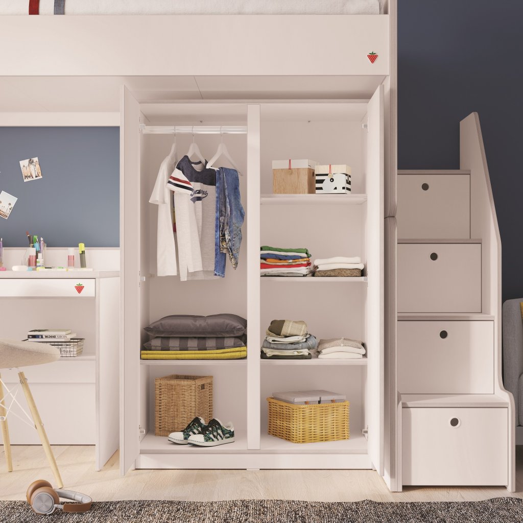 Funkčnost a s tím spojená úspora místa v dětském pokoji nebo pokoji pro studenta jsou hlavními přednostmi sestavy White Studio. Psací stůl pod vyvýšenou postel White Studio s pracovní plochou o rozměru 98x57 cm a pracovní deskou v standardní výšce 75 cm je vhodný pro malé i velké. Pod pracovní deskou v celé šíři stolu je umístěn šuplík s tlumeným dojezdem, který je uvnitř rozdělený na tři přihrádky pro lepší organizaci psacích a jiných potřeb. K uložení dalších potřeb je ve spodní části psacího stolu umístěna užší polička. Stůl je primárně určen k umístění pod zvýšenou postel a to hlavně z důvodu úspory místa v pokoji pro děti. Je možné ho ale samozřejmě umístit kdekoliv se bude hodit. Dalším prvkem této sestavy je dětská šatní skříň White Studio se třemi policemi, šatní tyčí a tlumeným dovíráním dveří, které jsou navrženy jako bezúchytkové. Vnitřní uspořádání polic a šatní tyče poskytuje dostatek prostoru na uložení různého druhu oblečení.