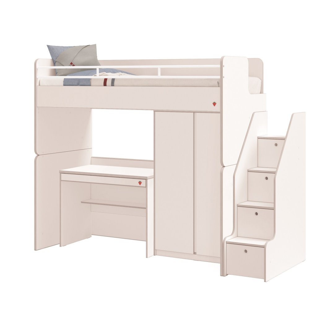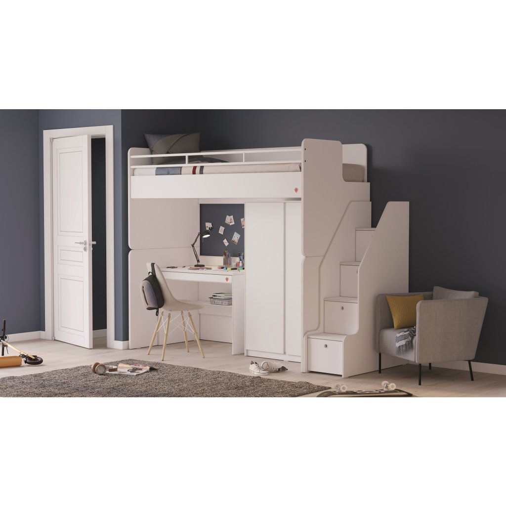 Vyvýšená dětská postel se schody, psacím stolem a šatní skříní White Studio